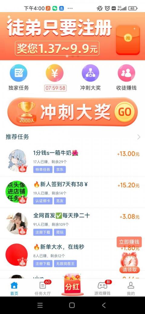 每邀1位好友得1到9元,徒弟徒孙做任务你永久抽成!躺赚模式爽翻天!