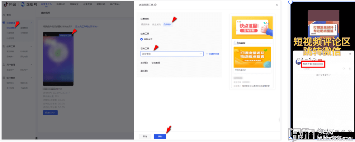 企业号后台短视频管理-添加经营工具-官网主页-添加,即可实现评论页链接跳转微信,详见上方效果演示