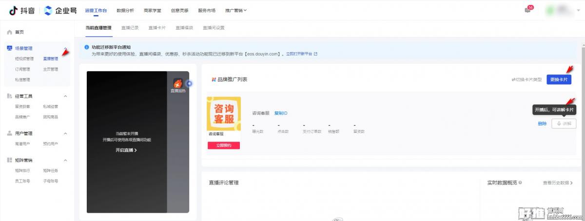 企业号后台场景管理-添加直播卡片-讲解,即可实现评论页链接跳转微信,详见上方效果演示(手机端直播也可操作设置,这里不再赘述)