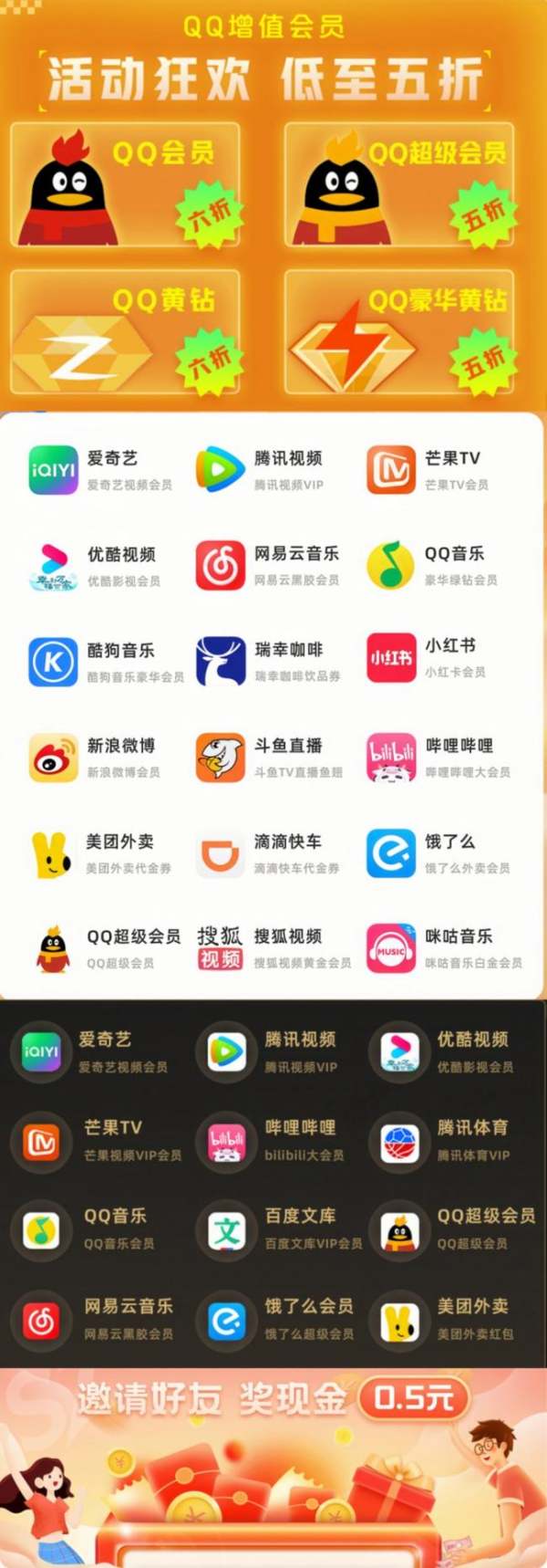 QQ增值服务系列五折大放送!QQ会员、 QQ超级会员!QQ黄钻、 QQ豪华黄钻!