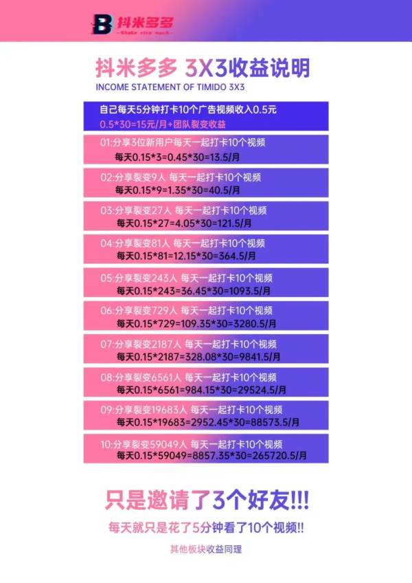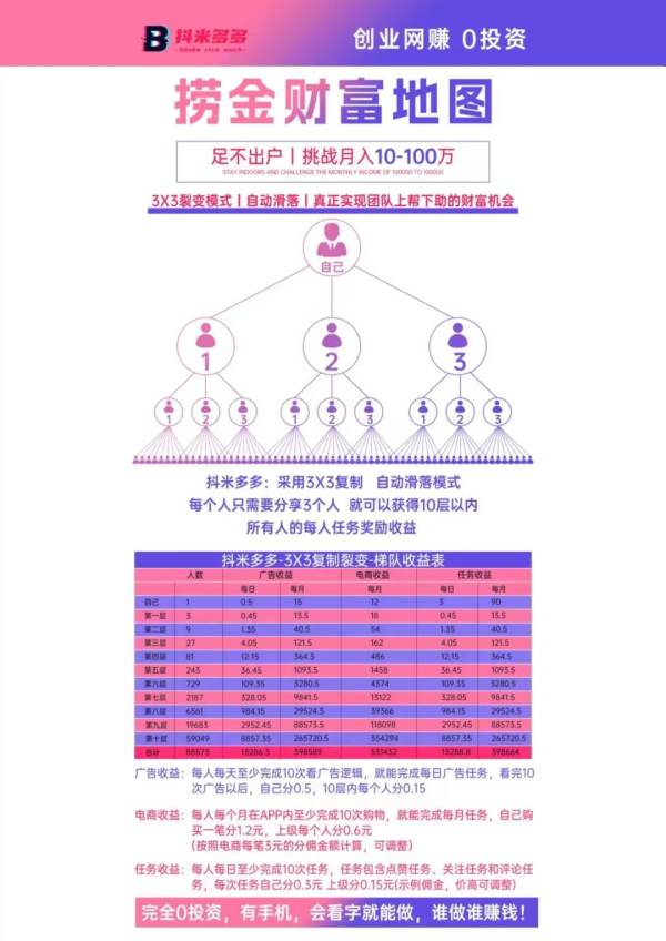 抖米多多 0投资3X3复制 10层滑落模式 上帮下助赚钱