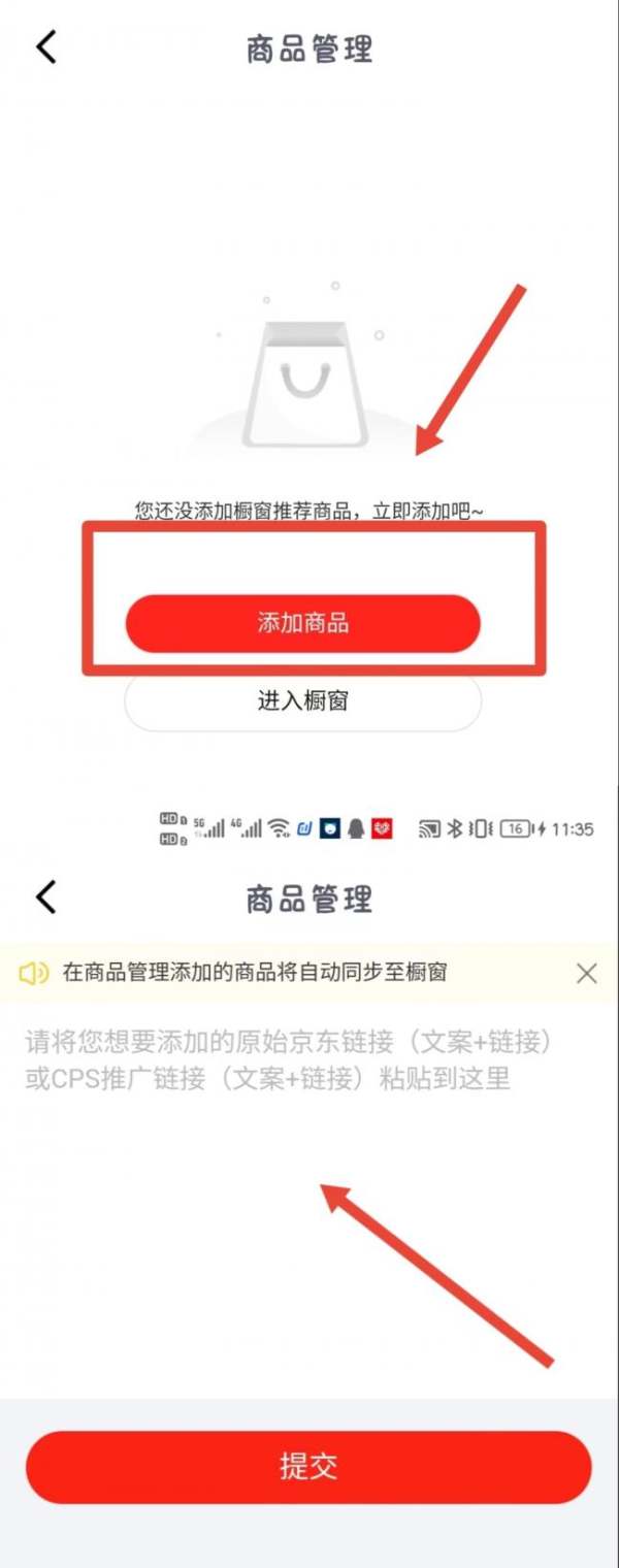 ②:打开(京东APP)→选择好商品进行复制→打开(京小街)→选择(商品管理)→(添加商品)→把复制好的京东商品链接黏贴进去→点击(提交)