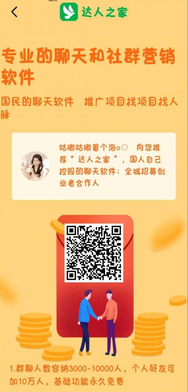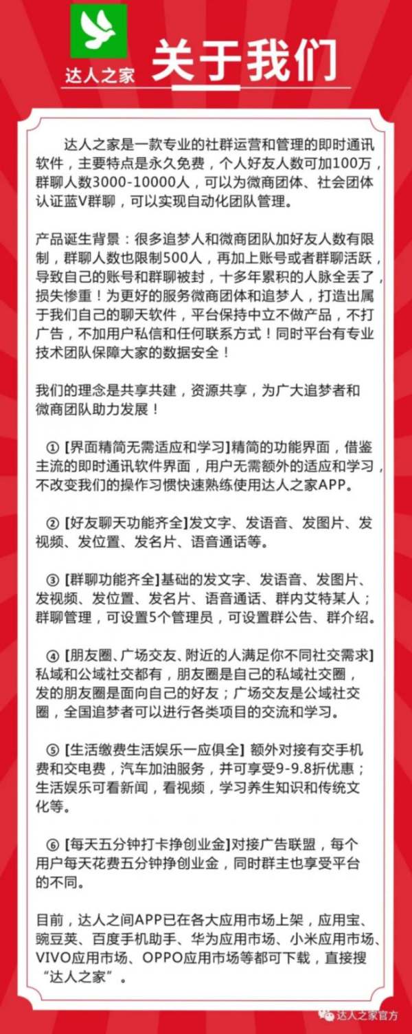 ③:“达人之家APP”是打造专业的属于我们自己的聊天软件,链接万千商户;接入面临困境的中小微企业;功能齐全,软件基础功能永久免费使用,永不封号永不封群!