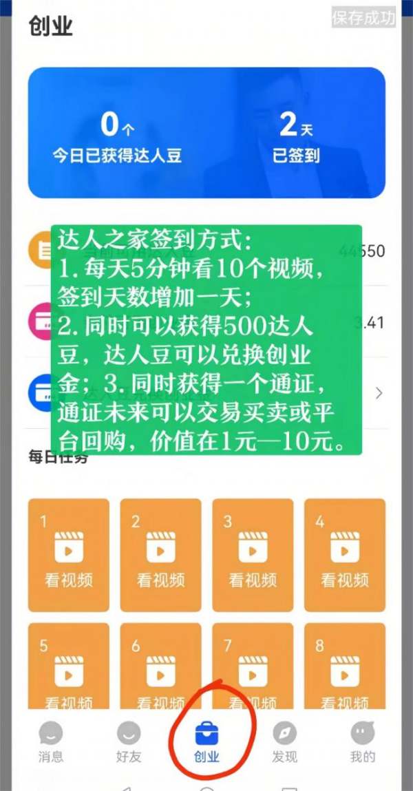 ②:然后在创业里面看3分钟的视频,完成当日的任务,即可获得520个达人豆和1个通证,通证就相当于股权,后期可参与平台的分红,4000个达人豆可以兑换1元现金!