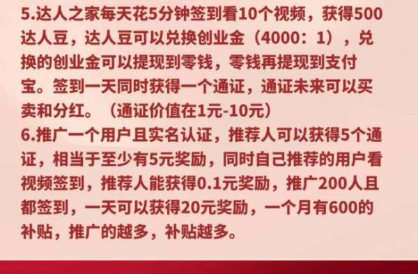 ⑤:达人之家注册后在我的-设置里面简单实名认证,在(创业)板块每天花5分钟签到看10个视频,获得520个达人豆,达人豆可以兑换创业金(4000:1),创业金可以提现到零钱,零钱再提现到支付宝!