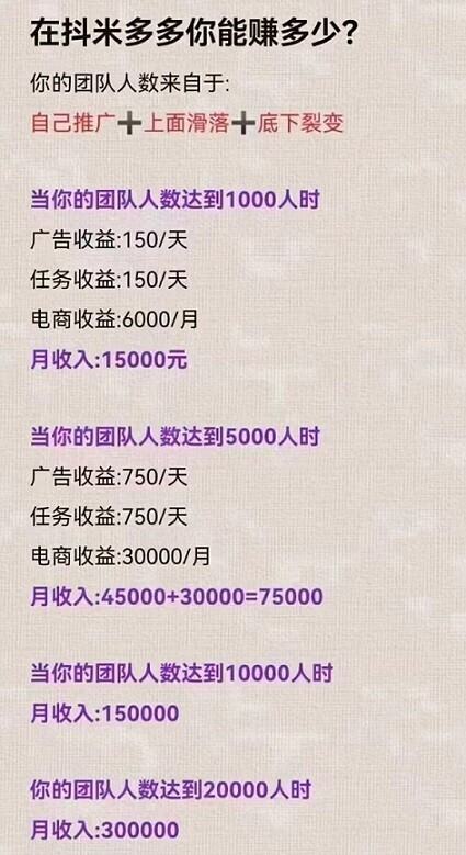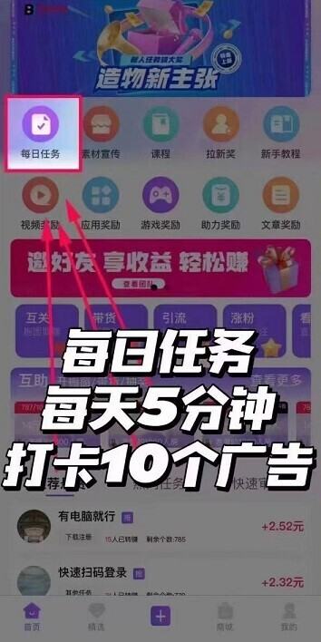 业务模型板块主要以营销任务+抖客电商+直销短视频变现,广告板块最为简单轻松,每天花5分钟时间完成看10条广告,即可获取0.5元收益,你推广3人成为会员以后,下面的人每天看10条广告,每个人给你贡献0.15元。
