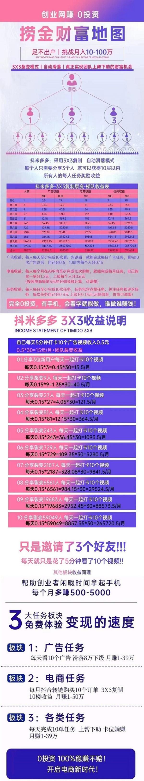 只要推广三人,就能开启3ⅹ3复制、10层滑落模式,你分享3个人,这3个人每个人分享3个人就是9个,9个每个人分享3个人就是27个,以此类推,直到第10层满共8万多人,只要他们每天看10条广告,做完每日任务,你都有0.15元收益。