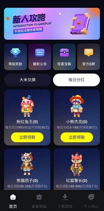 打金得到的金元宝可在首页惊喜宝箱处开启宝箱,宝箱可开出分红宠物、普通宠物和零钱,普通宠物直接换米,分红宠物每天领分红。