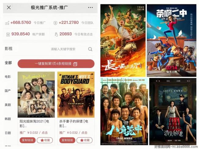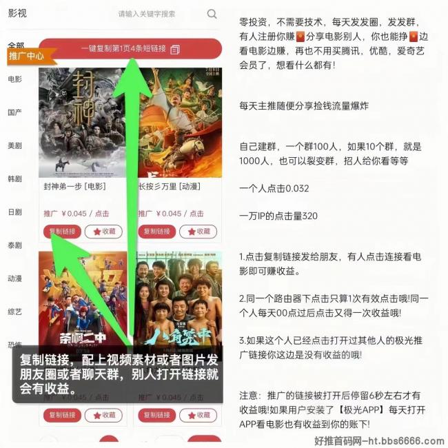 你把好看的电影、电视剧……等分享了出去,别人点进去和你一起看了,或者是别人点进去看其它的影视剧集了,你都能够有收益入账!别人每一次点击,你就能有0.045米!