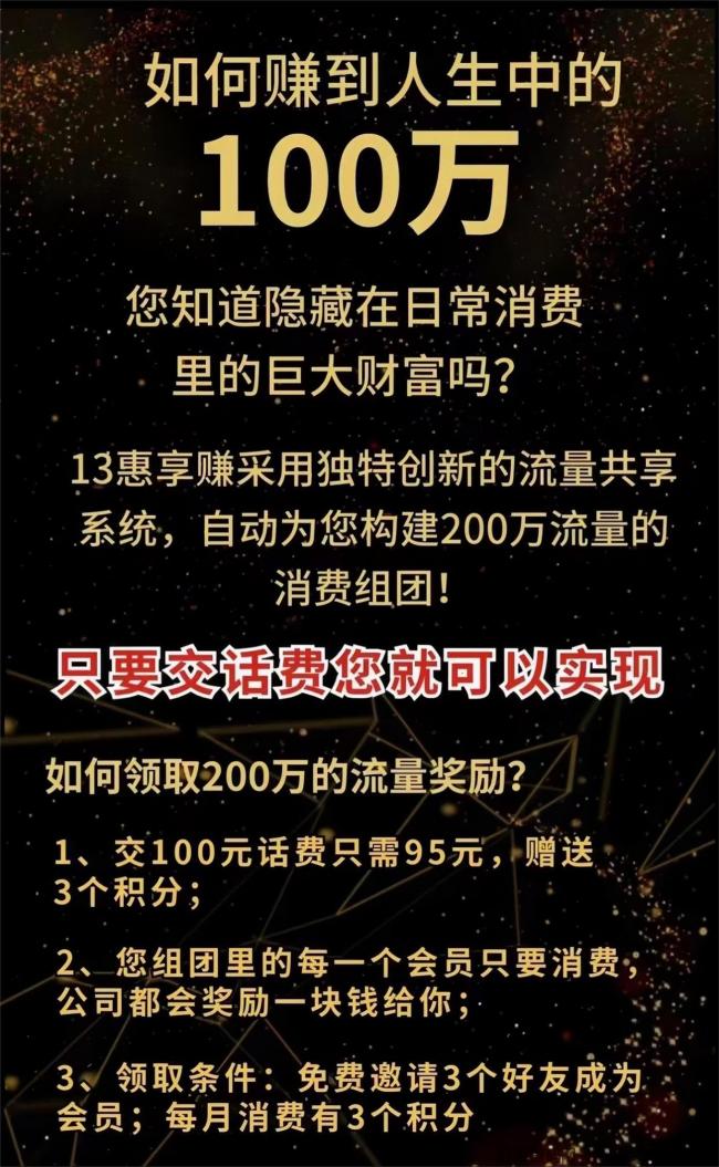 13惠享赚,创新的流量共享系统,注册就自动为您构建200多w流量的消费组团架构!