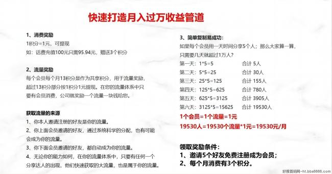 进入系统以后,每月就凭95折充话费自用这一项,就能够盘满钵满,其他的高积分商品也在陆续的上架当中……… 公司秉持着流量红利共享的原则,但凡是系统注册的会员,都能够参与分配…… 赶紧的,免费注册来占位子的,还需要犹豫吗?