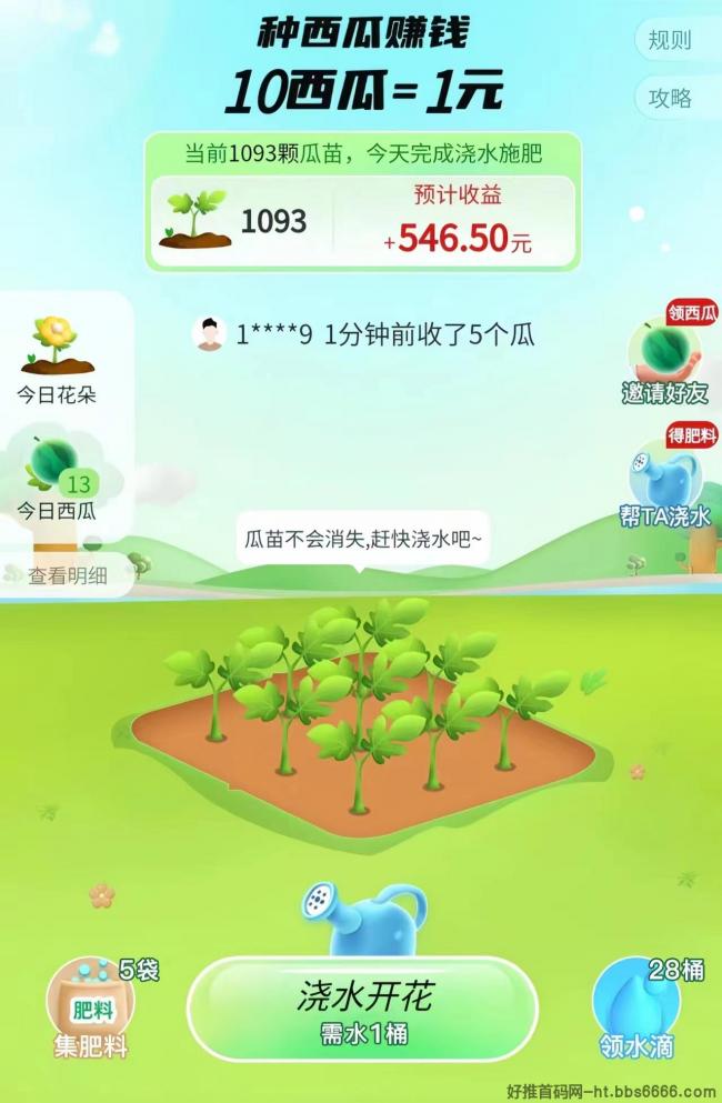 ④:施完肥,就能领五颗西瓜,西瓜可以在平台内直接出售!