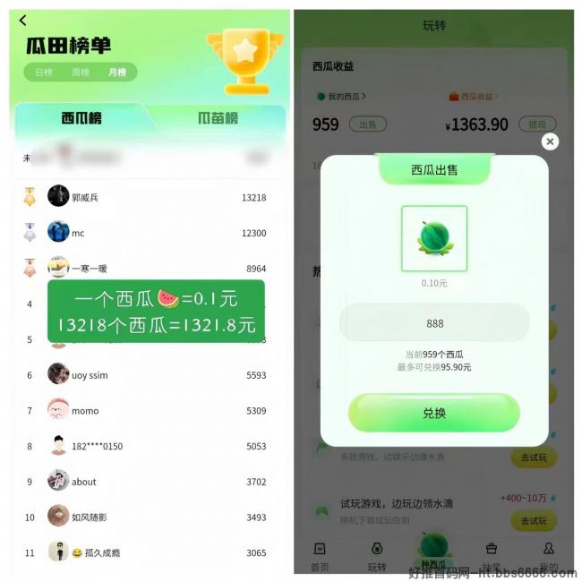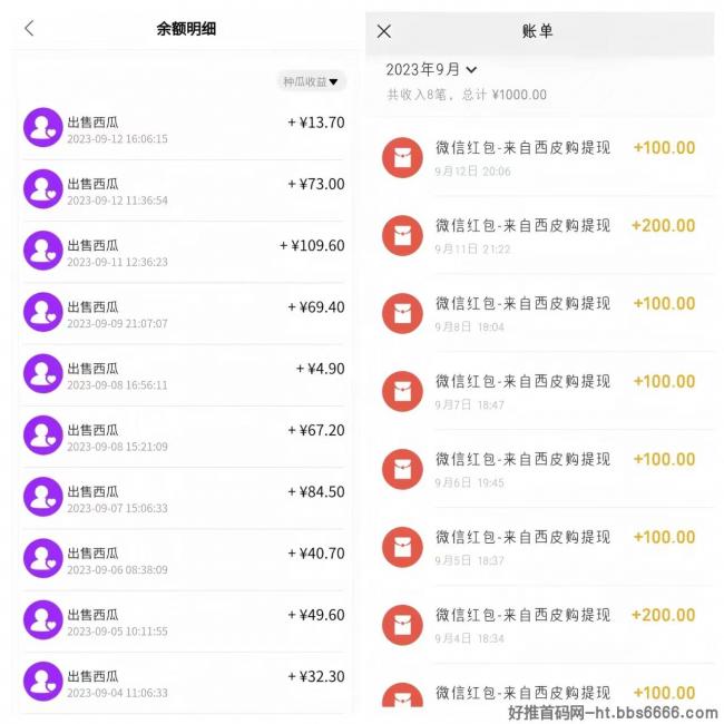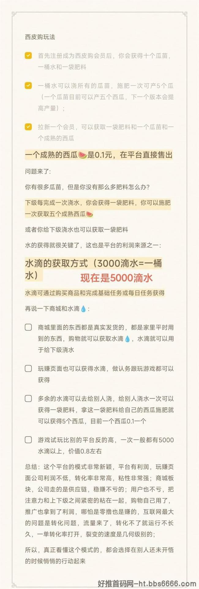 ⑥:【核心的玩法】就是:种西瓜赚米,10个西瓜一米,100个西瓜10米!