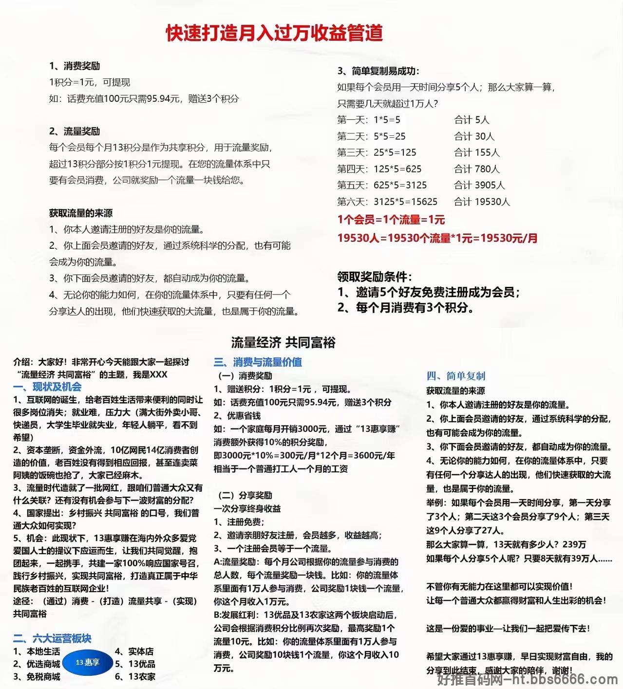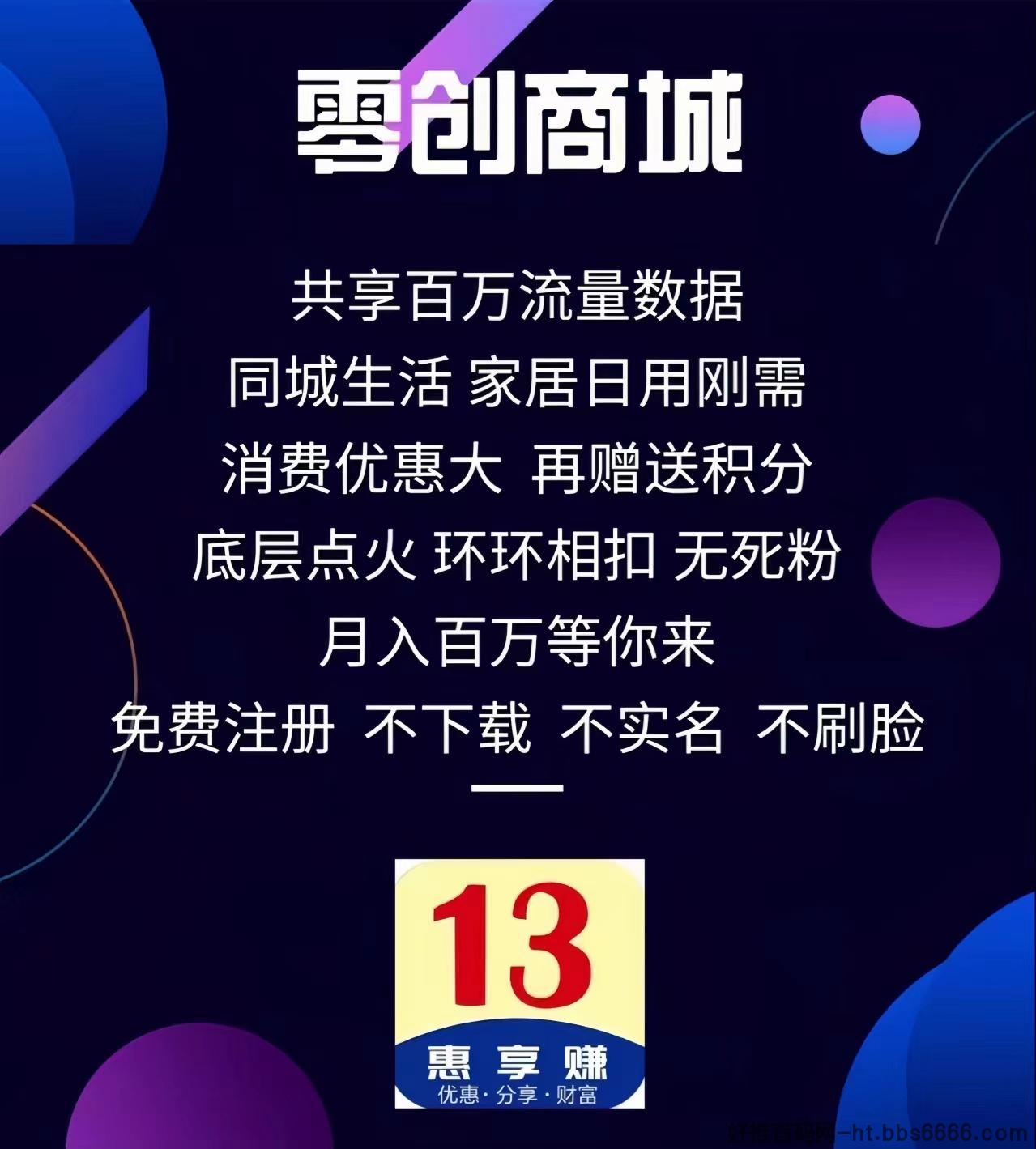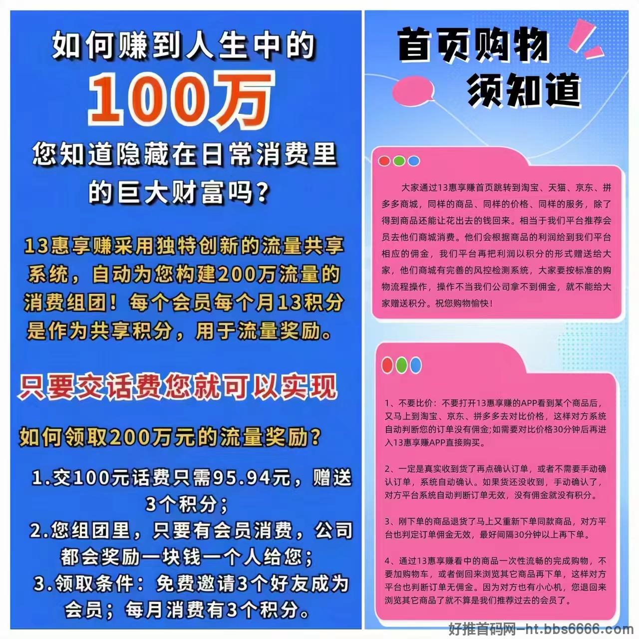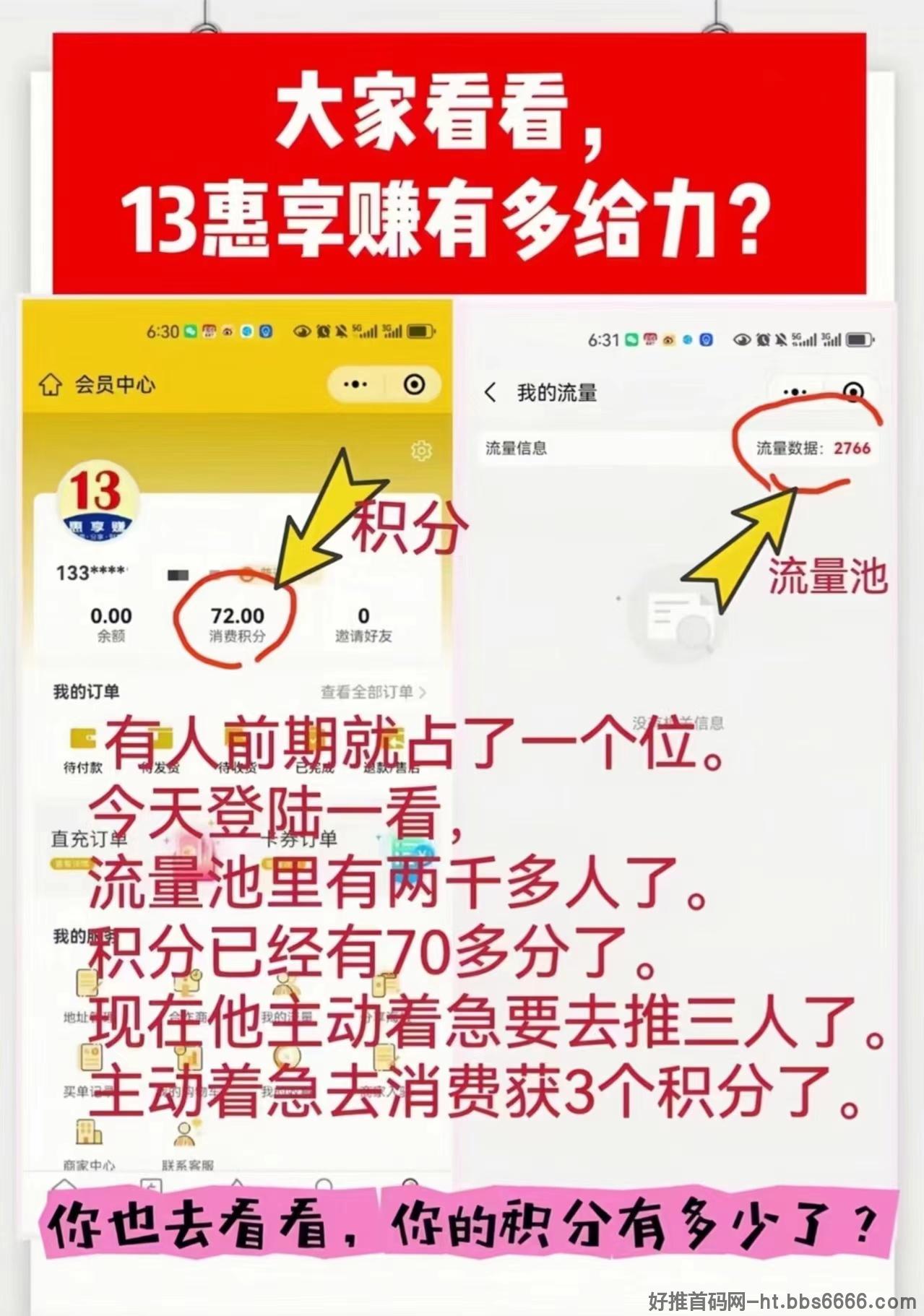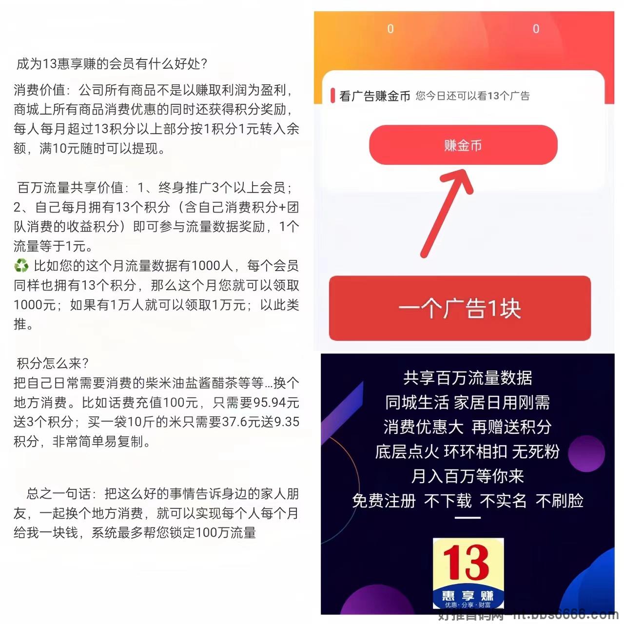 13惠享赚,创新的流量共享系统,注册就自动为您构建200多w流量的消费组团架构!