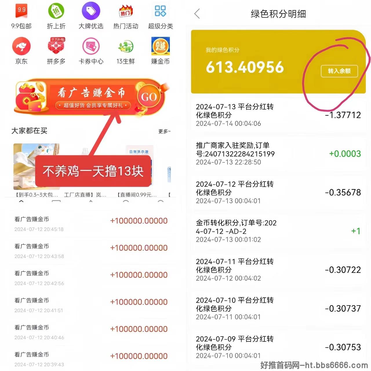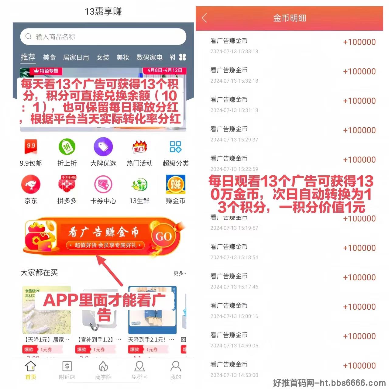 ①:每天只需要看13个广告(130万金币)13元,金币次日自动兑换成绿色积分,10万金币=1积分!