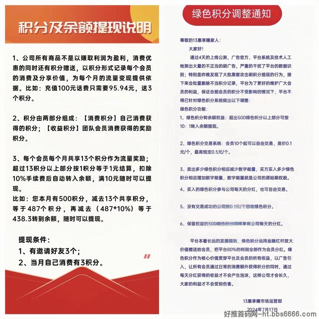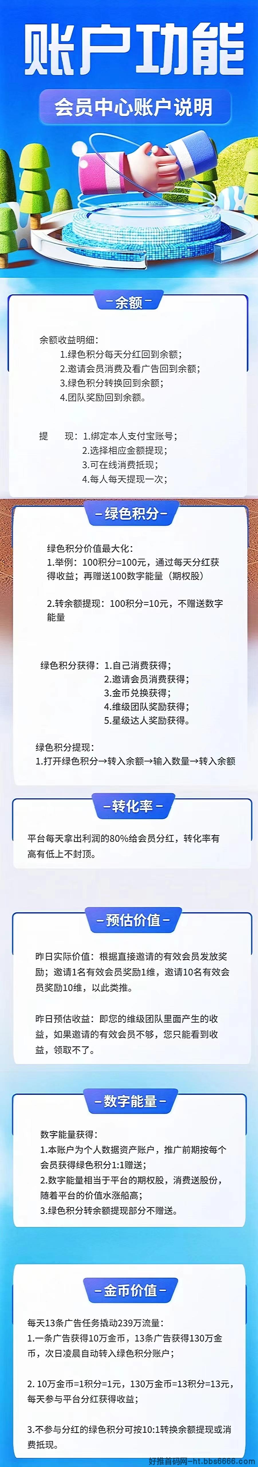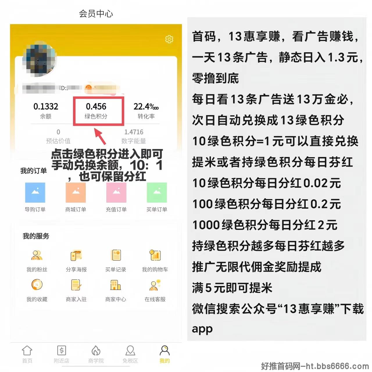 绿色积分可以直接兑换成余额(10:1),并进行提现!也可以持有参与永久分红!